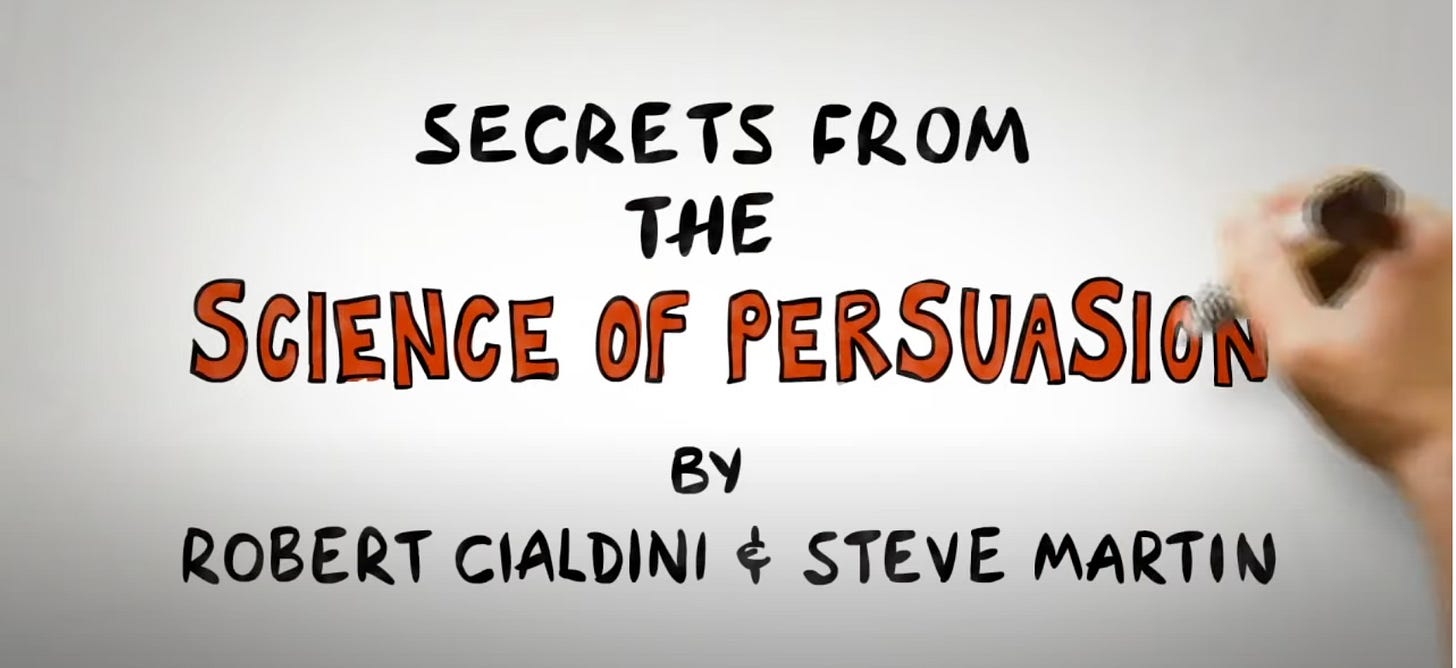 One thing that stood out to me this week was a YouTube video called “Robert Cialdini – Science of Persuasion.” Definitely interesting. 10/10, would watch again.