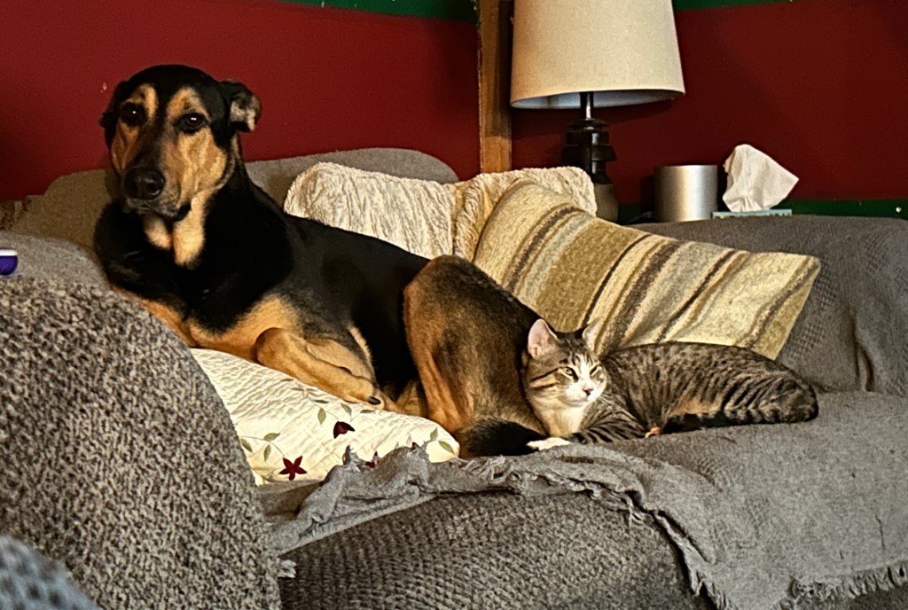 When people say “aggressive breed,” I cringe internally. It’s ridiculous. These dogs spend their mornings running around with chickens. One takes a while to lay on the ground each morning and watch bugs crawl. They lick the goats noses through the fence. These big, scary dogs snuggle on the couch with our kittens.